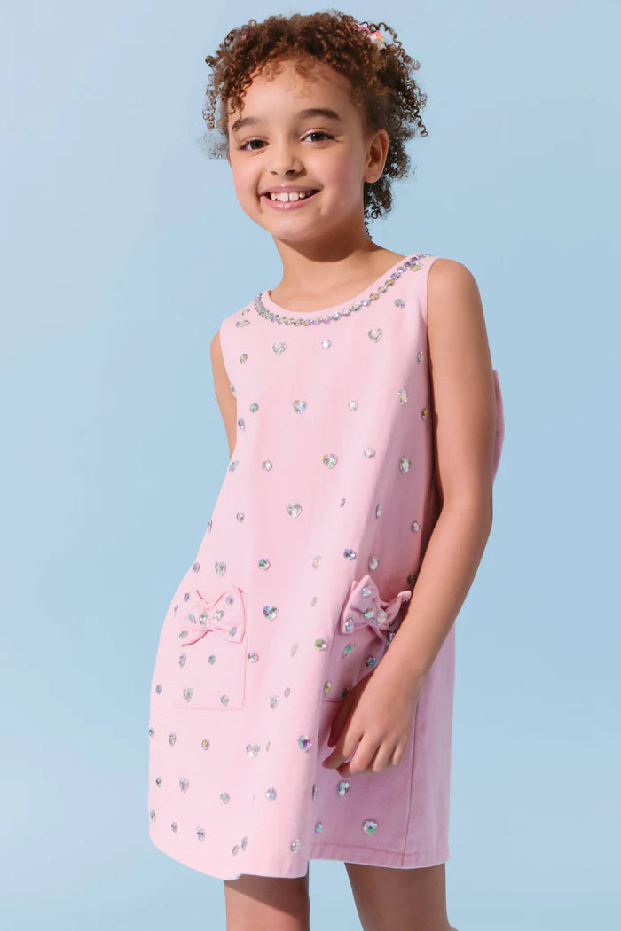 Stunning pink denim dress embellished with sparkling crystal heart details.